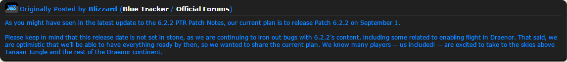 The much anticipated patch 6.2.2 seems to be just around the corner. According to a recent blue post, it’s tentative release date is going to be September 1st. That’s much sooner than my cynical self anticipated. I thought this patch would get dragged out as long as possible for no other reason than content spacing. Since it’s supposedly implementing flying, this should bring some much needed excitement back to Draenor. That’s at least the plan right?
